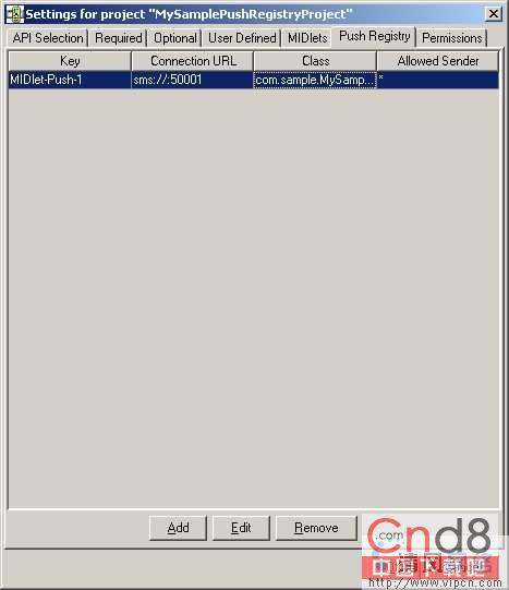 4.现在进入push注册标签。点击添加按钮。将会出现一个弹出窗口。在连接URL域中输入sms://:50001,在类域中输入com.sample.MySamplePushRegistry,在答应发送者域中输入*。请参考图5。