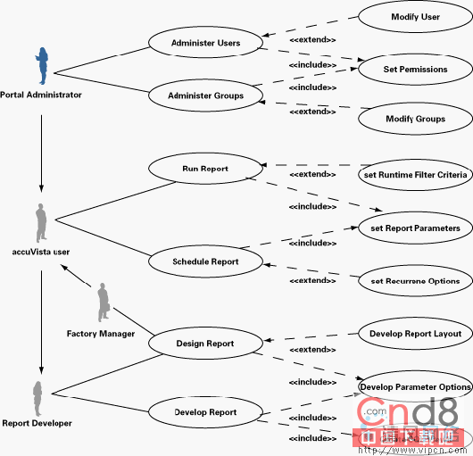 事例图提供了关于 accuVista 门户应用程序是如何被使用的高层视图。开发人员、产品经理或工厂治理人员都会对产品是如何运转有个大致的了解。