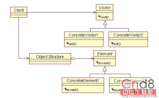 5) 对象结构角色(Object StrUCture):这是使用访问者模式必备的角色。它要具备以下特征:能枚举它的元素;可以提供一个高层的接口以答应该访问者访问它的元素;可以是一个复合(组合模式)或是一个集合,如一个列表或一个无序集合。