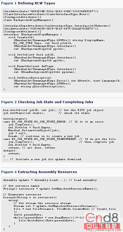图 1 中的代码有很多的属性(ComImportAttribute、GuidAttribute、MarshalAsAttribute 等等),这使真正的代码看起来不明显。 事实上,没有真正的代码。 接口和类的定义实际上仅仅是元数据形式的封送占位符,公共语言运行库 (CLR) 用它来直接调用 BITS COM API。