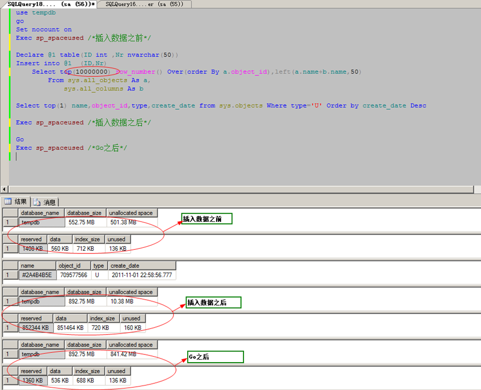 < 脚本S13.>中,我多写了一个”GO”之后检查空间大小的存储过程sp_spaceused。这样为了了更能体现表变量使用空间变化情况。从插入数据前和插入数据后的结果图来看,表变量不仅在数据库tempdb创建了表结构#267ABA7A类似的这样表,表变量也应用到了数据库tempdb的空间。不过这里注意一点就是在”Go”之后,我们发现表变量@1,会马上释放所使用的数据空间。为了更能体现使用空间情况。我们可以向表变量@1插入大量数据看空间变化情况(测试插入1000万的数据行)。