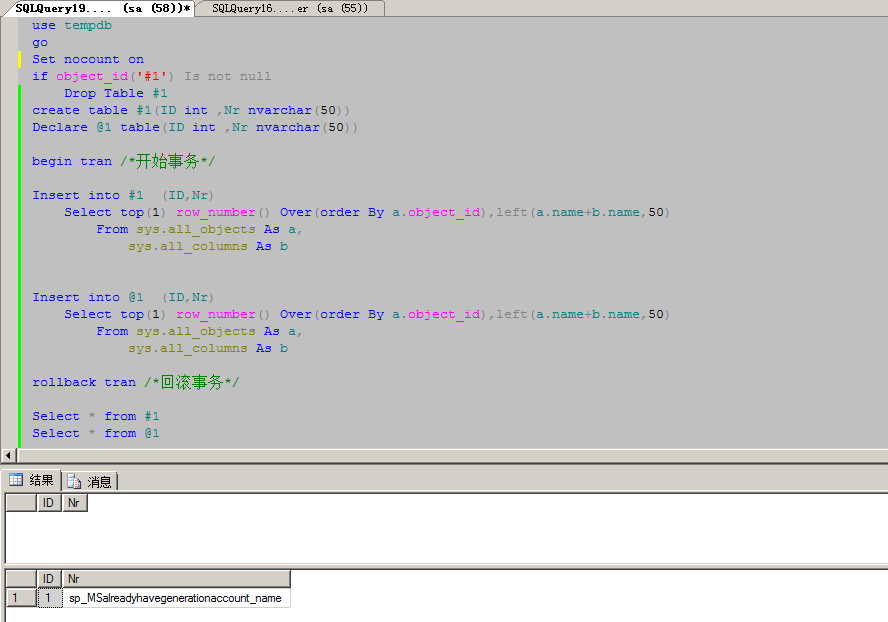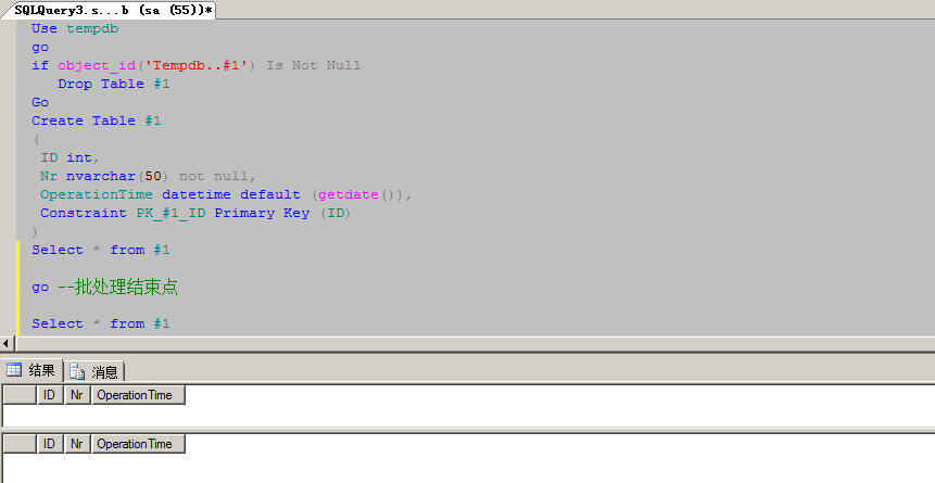 e.g. 在MSSMS中我们先执行之前<代码S1.>的创建临时表#1,不关闭当前会话的情况下,另建一个查询,执行与<代码S1.>相同的代码,如图