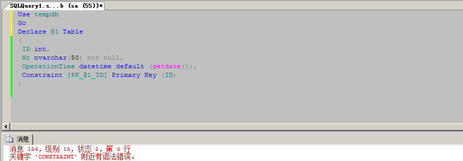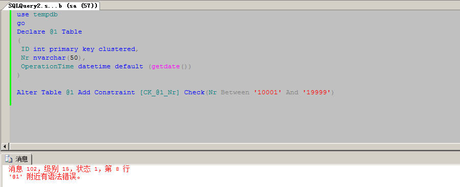 < 脚本S1.>中,可以看出在临时表#1的创建时,创建Constraint如“Constraint PK_#1_ID Primary Key(ID)”,也可以在创建临时表#1后创建Constraint,如“Alter Table #1 Add Constraint CK_#1_Nr Check(Nr Between '10001' And'19999')”,下面我们来看表变量的场景,在定义表变量时不能指定Constraint名,定义表变量后不能对表变量创建Constraint。