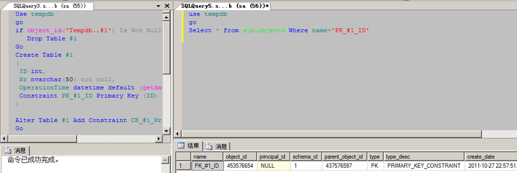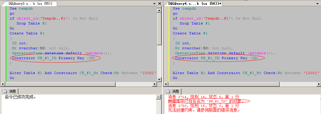 左边的查询窗口,是执行原先的<代码S1.>,右边的查询窗口,是后执行相同的<代码S1.>。在这里,我们注意红色圈圈部分,发现在创建临时表#1的过程,明确给了一个主键名称“PK_#1_ID”,当右边再创建相同临时表#1的时候就发生了对象重复错误问题。我们也可以通过SQL Server提供的系统视图sys.objects查询约束“PK_#1_ID”的信息,