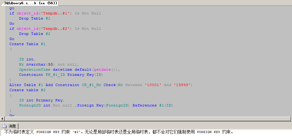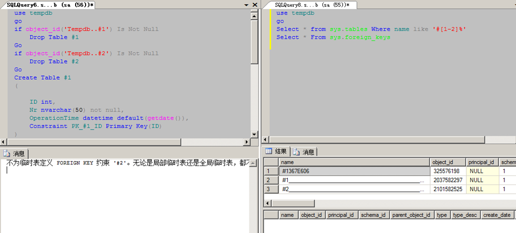 右边的查询,只看到在sys.tables表哦中存在刚才创建的临时表#1和#2,在sys.foreign_keys看不到有关Foreign Key约束信息。这也验证了左边SQL Server提示的,在临时表中无法强制使用Foreign Key约束。