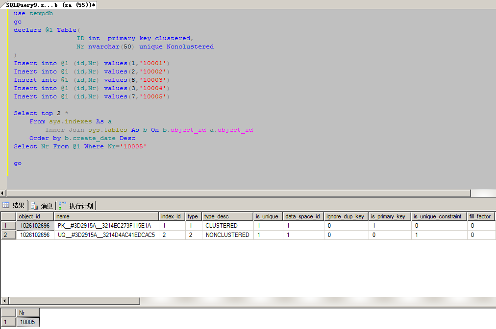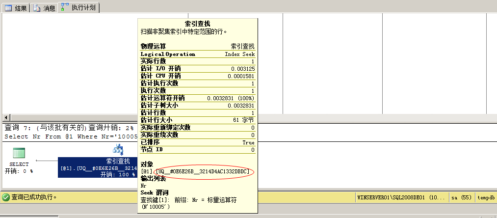 上面截的是两张图,第一张图描述在表变量使聚集Primary Key,创建非聚集的Unique约束,第二张图描述查询语句”Select Nr From @1 Where Nr='10005'” 应用到在表变量创建的唯一索引“UQ_#……”
