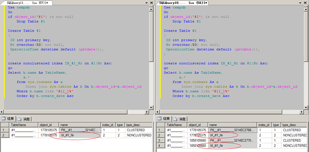 从返回的结果,我们看到在系统视图表Sys.Indexes中,创建有两个相同的索引”IX_#1_Nr”,但注意下object_id数据不同。在SQL Server中是允许不同的表索引名称可以相同的。在并发的环境下,按原理是可以对临时表创建的索引给明确名称的。除非并发的情况会发生重复的表名或重复的Constraint,或其它系统资源不足的问题,才会导致出错。