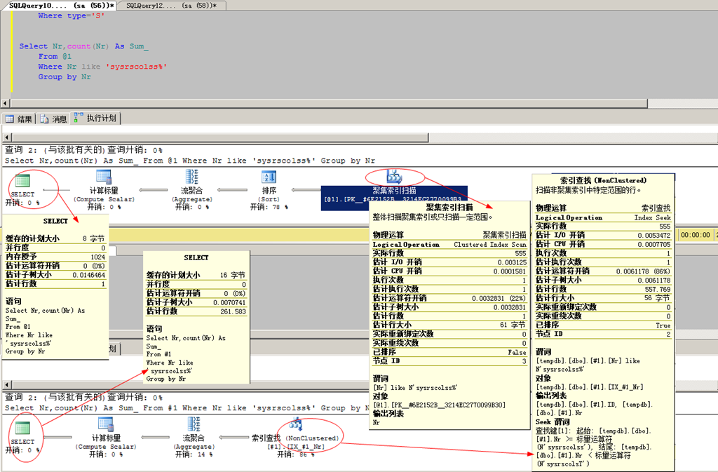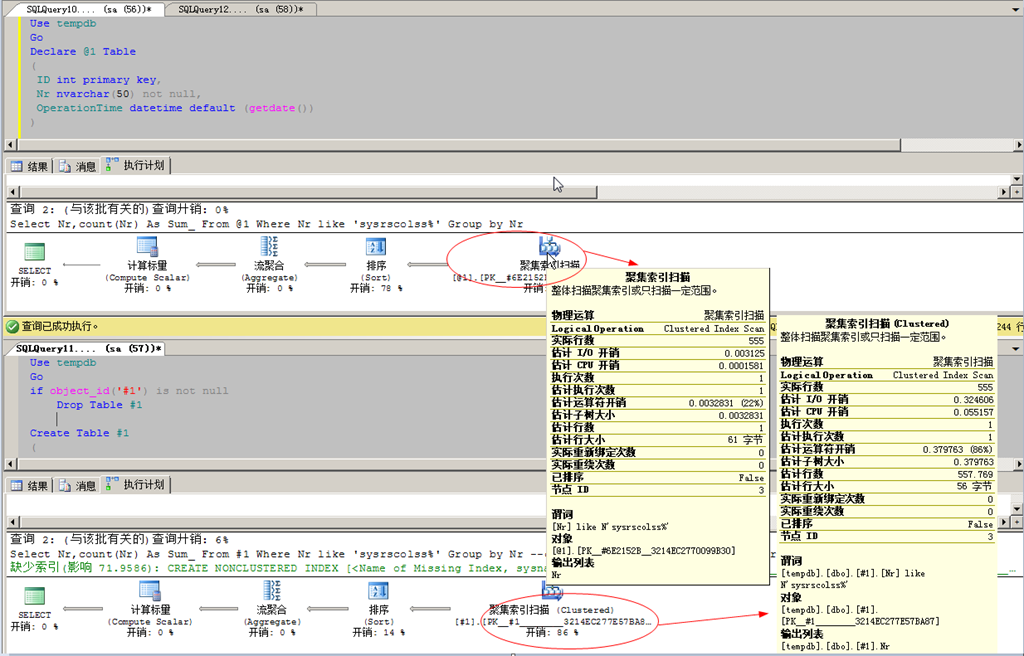 < 脚本S7.>和< 脚本S8.>,主要是看最后的查询语句I/O的开销,两者有何不同。通过上面的运行结果图形描述,可以看出查询开始,不管是临时表还是表变量,都使用到了聚集索引扫描(Clustered Index Scan),两者虽然返回的数据一致,但I/O的开销不同。临时表的I/O开销是0.324606,而表变量只有0.003125 相差非常大。在临时表的执行计划图形中,我们发现一行“缺少索引(影响 71.9586):CREATE ……)”提示信息。我们对临时表#1,在字段“Nr”上创建一个非聚集索引,再看执行执行结果: