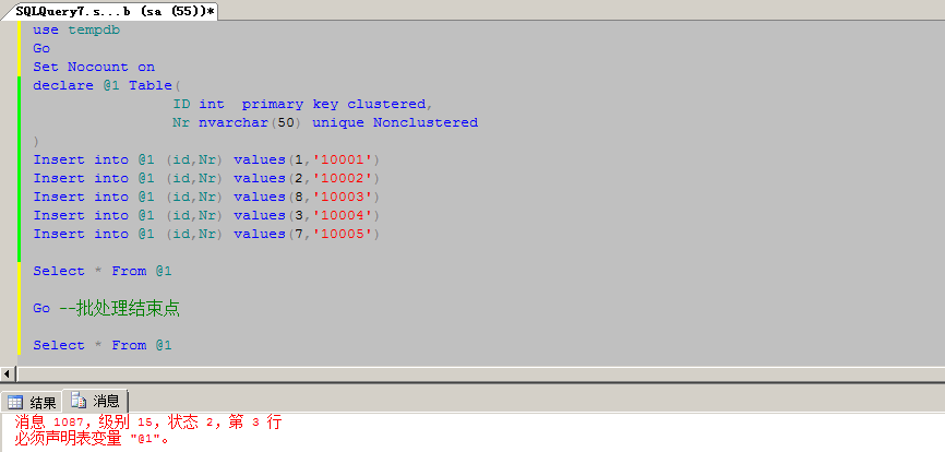 < 脚本S9.>所在的查询相当于一个会话,”Go”描述的一个批处理的结束点。在”Go”之前定义的表变量,在”Go”之后调用是发生“必须声明变量@1”的错误提示。