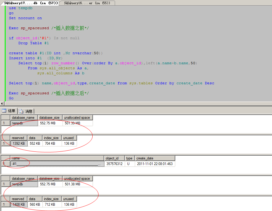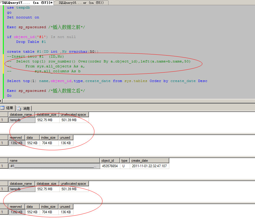 这里你会发现前后的空间大小不变,不过,不要认为没有使用到数据库tempdb数据空间,当你多用户创建临时表结构的时候,你就会发现其实都会应用到数据库tempdb的空间。我这里创建了10个#1后的效果如: