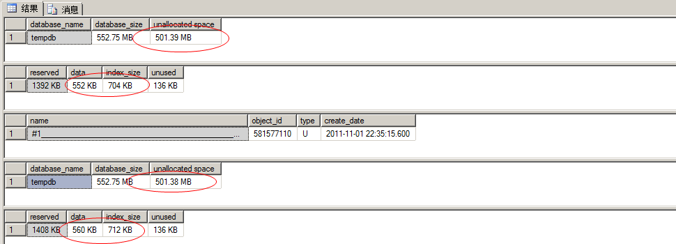 在< 脚本S12.>执行后,我们可以看到在数据库tempdb中的表sys.tables创建有表#1。我们接着看空间的使用情况,插入数据之前,数据库未使用空间(unallocated space)为510.39MB,向临时表#1插入1条数据后,数据库未使用空间为501.38MB,未使用空间变小了。再来看整个数据库的数据(data)使用的空间变化,从552KB变成560KB,使用了一页的数据空间(8kb)。这说明一点,临时表,即使你只插入一条数据都会使用到数据库tempdb的空间。也许会有人问,要是我只建临时表#1,不插入数据,会如何。我们可以结果: