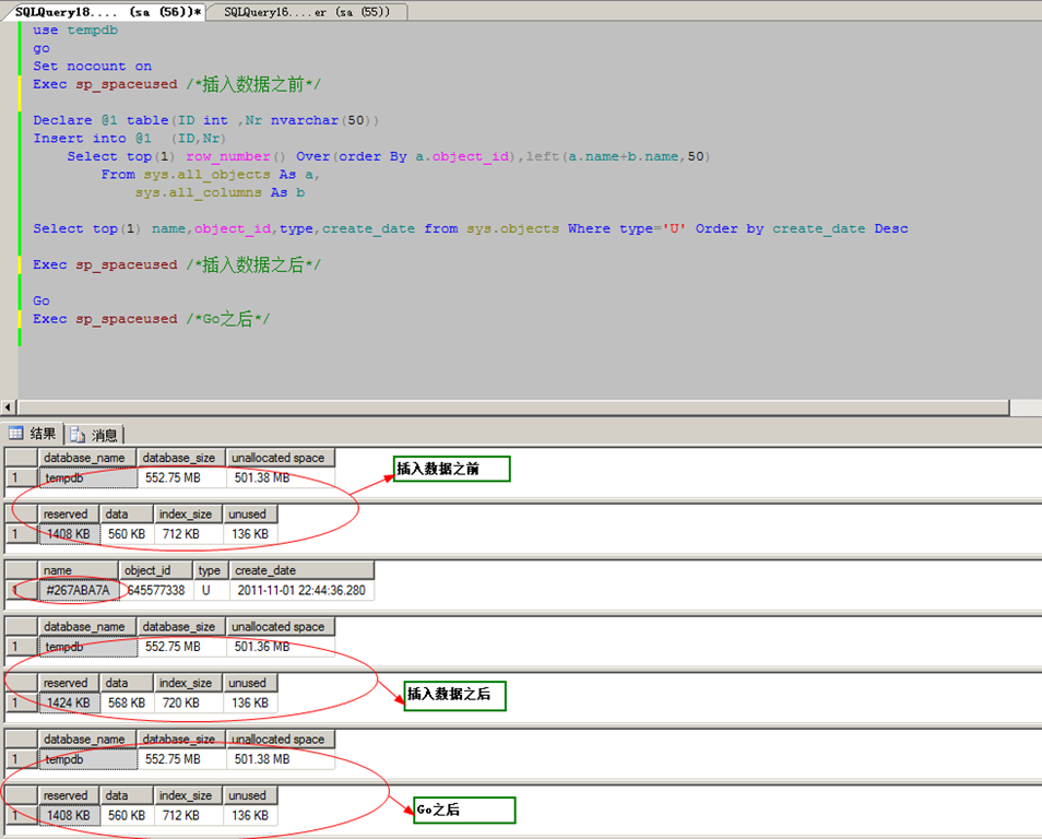 这里我们可清晰的看到数据库tempdb的大小(database_size)变化情况,从插入数据前的552.75MB变成插入数据之后的892.75MB。非常有意思的是我们在”Go之后”发现数据库大小保存在892.75MB,但数据使用空间(data)从560KB—>851464KB—>536KB ,说明SQL Server自动释放为使用的数据空间,但不会马上自动释放数据库分配的磁盘空间。我们在实际的环境中,发现临时数据库tempdb使用的磁盘空间越来越大,这是其中的原因之一。