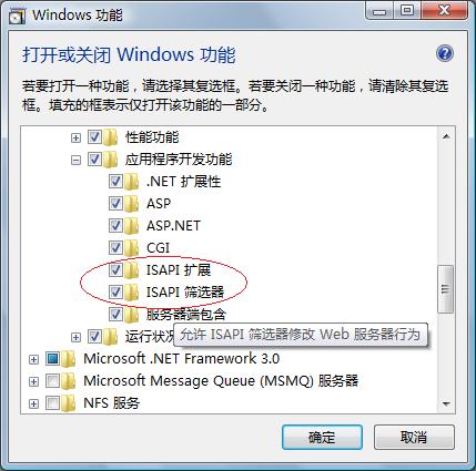 还要确认一点,在Vista的“打开或关闭Windows功能”里不但要安装IIS,而且还要安装两个重要的ISAPI组件,如下图: