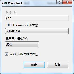 4、打开Vista管理工具中的“Internet信息服务(IIS)管理器”,在“应用程序池”中新建一个应用程序池,取名为PHP,.Net版本为“无托管代码”。