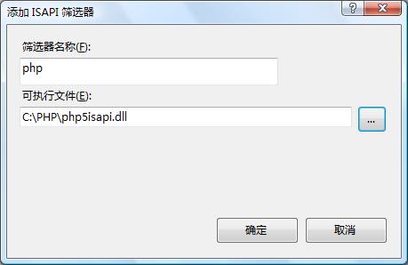5、在“ISAPI筛选器”中点右键“添加”,起名为php,可执行文件选成C:\php\php5isapi.dll。