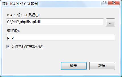 6、在“ISAPI和CGI限制”里点右键“添加”,路径还是选成c:\php\php5isapi.dll,描述还写成php,选中“允许执行扩展路径”。