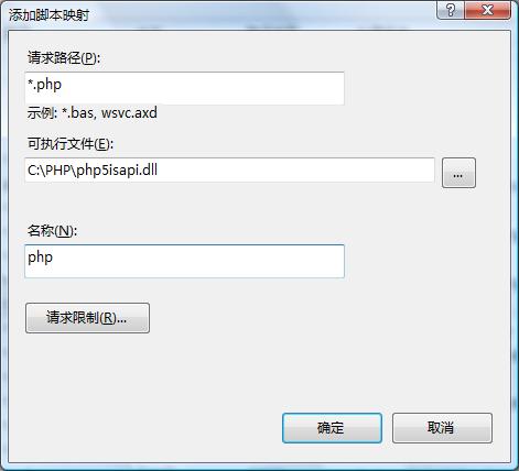 7、在“处理程序映射”里右键“添加脚本映射”,请求路径填*.php,可执行文件还选c:\php\php5ispai.dll,名称还叫php。