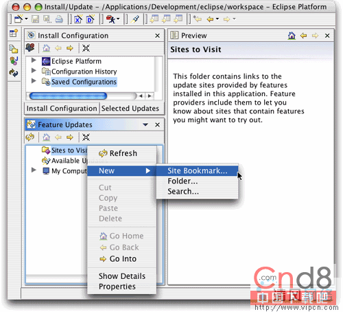 启动Eclipse,顺次单击帮助(Help) ->软件更新(Software Updates) -> 更新治理器(Update Manager)来打开更新治理器,当安装/更新(Install/Update)透视图打开之后,在功能更新视图(Feature Updates)中用右键单击(假如你用的单键,你需要control-click)。选择新建(New) -> 站点书签(Site Bookmark),如图1中所示。