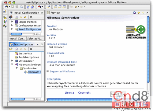 Hibernate Synchronizer可以用Eclipse内置的更新治理器(Update Manager)来安装。对Eclipse 2.1和即将发布的Eclipse 3的用户提供了不同的更新站点。(因为用Eclipse作要害性的工作,我仍使用作为产品发行的2.1版。当我写这篇文章的时候,Eclipse 3已经进入了“候选发布”阶段。我希望当我今夏晚些时候从JavaOne回来时,我可以更新到版本3的产品发行版。提及这个的主要原因是因为我想强调一下,这些指南是以Eclipse 2的角度的来讲解,毫无疑问,一些命令和窗口会在版本3中发生变化,因此,当你使用Eclipse 3时,你应当做一些相应的调整。我印象中Hibernate Synchronizer自己的install instrUCtions是针对Eclipse 3,也许这对你有所帮助。