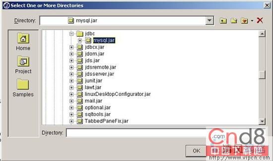 5) 单击 Add... 按钮来查找并添加数据库的 JDBC 驱动,当然了,我们到 D:JBuilder7libjdbc 下去找,选 mysql.jar ,注重,不要把mysql.jar 展开,象图那样选中再按 OK 就行了。