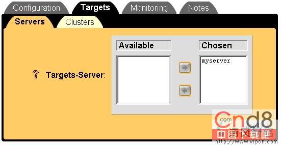 5) 同样,选 Targets 签,选 Servers 签,选 Available (可用)中的 myserver ,然后点