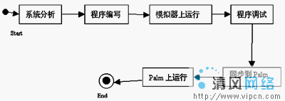 通常Palm应用程序的开发是利用台式PC编写,编写后编译成Palm应用程序,然后将其导入到台式PC的Palm模拟器中运行调试。程序调试完成后,通过台式PC与Palm的同步软件(HotSync)导入到真正的Palm硬件,从而实现应用程序在Palm硬件上的运行(见图1)。