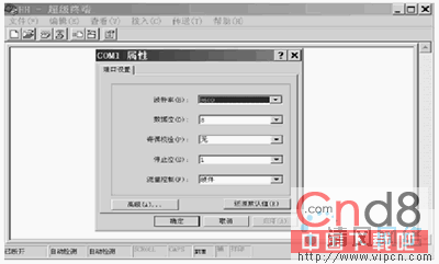 启动超级终端程序Hpertrm.exe,选定串行通讯端口(Com1或Com2),然后设定好通讯速率与校验位。例如串行通讯速率为9600波特,数据位为8位,无奇偶校验,停止位为1位(见图2、图3)。