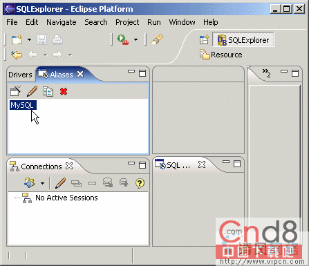 想要连接到 MySQL 数据库并提取其中的表格,我们需要为连接建立一个别名。一个连接的别名说明了连接设置,JDBC 驱动,URL,用户名和密码。在SQLExplorer视窗中选择 Aliases 标签。单击 “Create new Alias” 按扭来创建一个新的别名,如图7所示。