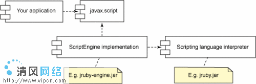 如前所述,代码将使用 ScriptEngine 实例执行脚本。脚本引擎充当脚本代码和最后执行代码的底层语言解释器或编译器之间的中间程序。这样,我们就不需要了解各个解释器使用哪些类来执行脚本。比如说,JRuby 脚本引擎可以将代码传递给 JRuby 的 org.jruby.Ruby 类的一个实例,首先将脚本编译成中间形式,然后再调用它计算脚本并处理返回值。脚本引擎实现隐藏了一些细节,包括解释器如何与 Java 代码共享类定义、应用程序对象和输入/输出流。