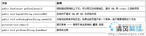 每个 JWebUnit 测试的核心都是 net.sourceforge.jwebunit.WebTestCase 类,它代表测试用例。每个测试用例都必须是从这个类扩展而来。(net.sourceforge.jwebunit.WebTestCase 类本身则是从 junit.framework.TestCase 类扩展而来的,它在 JUnit 中代表测试用例。) 表 1 描述了这个类的一些常用方法: