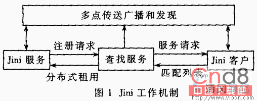 分布式安全模型及其实现定义了软件实体的认证方式及操作权限;发现与加入协议定义了服务加入JINI系统的方法;查找服务则是供服务注册登记的场所,这里提供了可以使用的服务对象集合。编程模型也是分布式的,包括租借(leasing)、分布式的事务处理和事件处理三种重要接口。