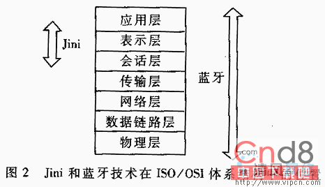 JINI与蓝牙技术是两种互补性很强的技术。蓝牙技术主要实现邻近的电子设备无线连接,是硬件设备的无线互连协议;JINI则是实现分布式软件服务(包括无线设备)的软件技术。蓝牙技术是对固定的一组协议间互操作的静态说明;而JINI的“移动代码”代理服务对象可以动态地互操作。两者在ISO/OSI的体系结构中的位置如图2的慰。JINI主要位于表示层和会话层,而蓝牙的协议栈贯空了整个体系结构。JINI的发现协议和分布式安全模型加强了蓝牙技术的发展进程和完全治理模块。