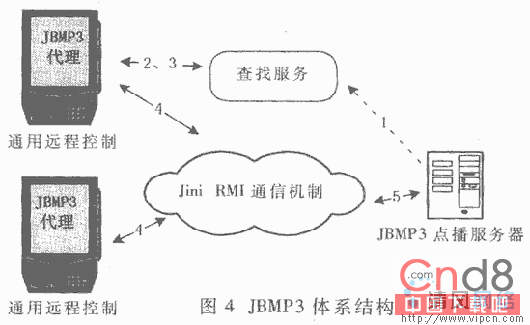 基于JINI与蓝牙开发了一个无线网络点歌器JBmp3。它具有以下功能:播放客户选取歌典、客户端图形界面、个性化定制客户播放列表。系统结构如图4所示。它由一个能播放音乐文件(mp3文件)的服务端程序、若干能控制服务程序的客户端程序(远程控制)和一个能支持JINI服务的查找服务组成。运行的网络是TCP/IP网络。