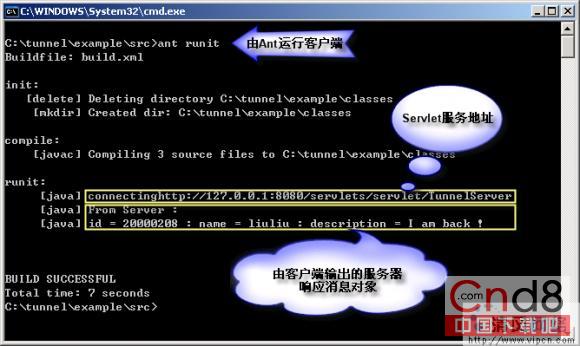 这里我们选择Jetty(Jetty 4.2.21)作为Web Server和Java Servlet的运行容器。编写普通的Java应用程序TunnelClient作为java隧道的客户端。编写Servlet程序TunnelServer作为java隧道的服务端。如下图,运行java隧道客户端程序,在程序内部调用隧道服务http://127.0.0.1:8080/servlets/servlet/TunnelServer。从服务器返回对象,对象内容打印在控制台上。