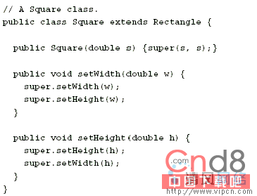 b.继续而来的setWidth()和setHeight()方法对于Square而言并非真正地适合,因为一个正方形的高和宽是相同。因此我们将需要重写setWidth()和setHeight()方法。不得不重写这些简单的方法有可能是一种不恰当的继续使用方式。
