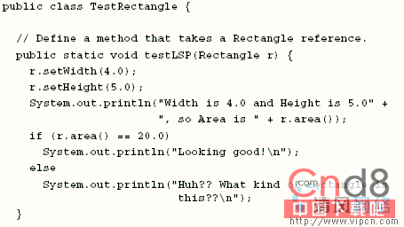 7.这里的问题出在哪里呢?编写testLsp()方法的程序员做了一个合理的假设,即改变Rectangle的宽而保持它的高不变。