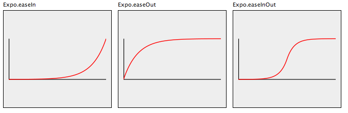 说MooTools框架动画要比jQuery强,其中之一就是MooTools动画内置了贝塞尔运动曲线关键字。如:'linear', 'quad:in', 'back:in', 'bounce:out', 'elastic:out','sine:in:out'等等(下图为Fx.Transitions方法之expo),而jQuery实现类似缓动效果,还需要借助ease插件。