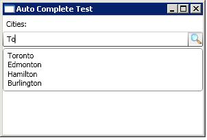 <Window x:Class="Gui.TestWindow" xmlns="http://schemas.microsoft.com/winfx/2006/xaml/presentation" xmlns:x="http://schemas.microsoft.com/winfx/2006/xaml" xmlns:ctr="clr-namespace:Gui.Controls" Title="Auto Complete Test" Height="200" Width="300" Loaded="Window_Loaded"> <StackPanel> <StackPanel.Resources> <ResourceDictionary Source="/Gui.Controls;component/Styles/AutoComplete.Styles.xaml" /> </StackPanel.Resources> <Label>Cities:</Label> <ctr:AutoComplete x:Name="autoCities" SelectedValuePath="CityID" DisplayMemberPath="Name" PatternChanged="autoCities_PatternChanged" Style="{StaticResource AutoCompleteComboBox}" Delay="500"/> <!-- can also do binding on selected value --> </StackPanel> </Window>