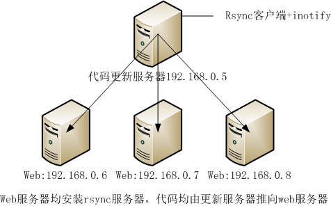 原理:由192.168.0.5上inotify服务监测文件是否有更新,如果有更新(修改,删除,新建)inotify就会通过rsync命令将更新的文件推向三台web服务器