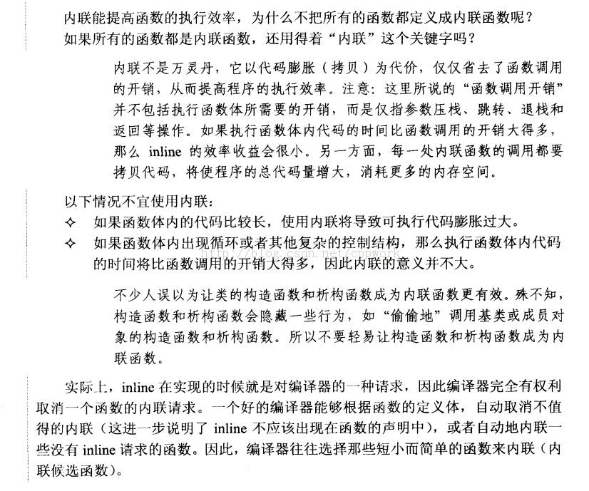 所以说,C++ inline函数是一种“用于实现的关键字”,而不是一种“用于声明的关键字”。一般地,用户可以阅读函数的声明,但是看不到函数的定义。尽管在大多数教科书中内联函数的声明、定义体前面都加了 inline 关键字,但我认为 inline 不应该出现在函数的声明中。这个细节虽然不会影响函数的功能,但是体现了高质量C++/C 程序设计风格的一个基本原则:声明与定义不可混为一谈,用户没有必要、也不应该知道函数是否需要内联。
