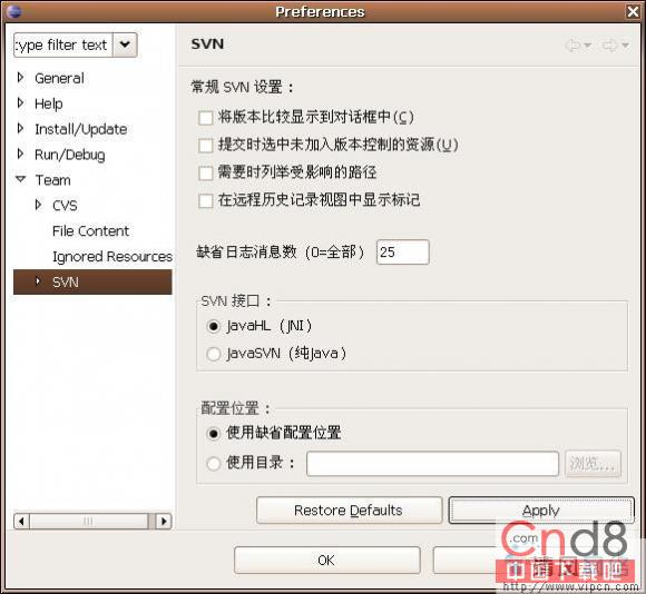 然后再启动 Eclipse, 进入 SVN 的设置页面, 果然现在可以选择 "JavaHL (JNI)" 方式了: