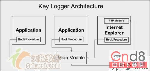键盘监视器由三个模块组成:主模块,钩子过程和FTP模块。主模块负责安装一个全局钩子过程。该钩子的任务是把每次按键事件向主模块汇报,由主模块把所有的击键保存到一个文件中。当记录文件达到预定的大小时,主模块命令FTP模块把记录文件上载给一个FTP服务器。三个模块间的通讯是通过Windows消息机制实现的。
