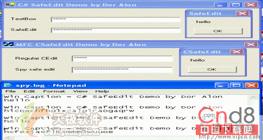 免于监视的编辑控件将针对每次用户击键生成一个模拟的随机键击串。监视程序将截获用户的击键和伪击键,这样以来使它很难或者不可能检索实际的输入的文本。用户输入被存储于一个成员变量中-应用程序可以轻易地通过编辑控件存取该变量的值。本例中的伪键击是通过调用Win32 API SendInput来实现的。下面这实现了两个控件-一个MFC版本,一个.NET版本。