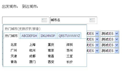 在淘宝旅行上看到的城市选择效果,感觉还不错,就自己的理解重新实现一遍,先看效果(有人说IE9下面有BUG,LZ用的是落后的XP,居然装不上IE9,去公司在搞搞好了),然后再细说实现原理,支持鼠标上下键选择城市,支持直接输入城市名称,拼音首字母,全拼,支持IE6遮盖SELECT,压缩后12K,