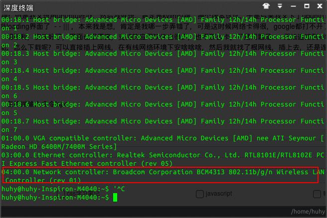首先查看你的网卡型号,在终端输入命令lspci,在某行如图