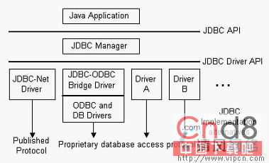 JDBC提供的接口主要有两种,一种是面向一般应用程序开发人员的JDBC API,另一种是底层的JDBC Driver API,如图1所示。
