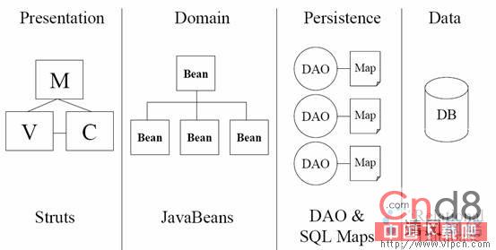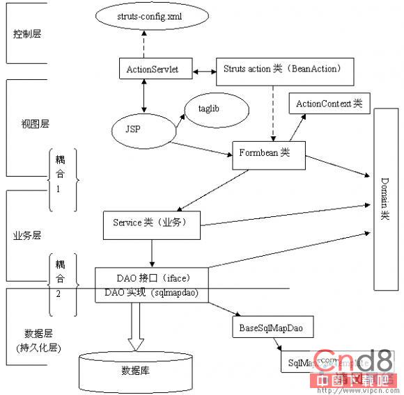 struts Action类只有一个:BeanAction.没错,确实是一个!与传统的struts编程方式很不同。再仔细研究BeanAction类,发现它其实是一个通用类,利用反射原理,根据URL来决定调用formbean的哪个方法。BeanAction大大简化了struts的编程模式,降低了对struts的依靠(与struts以及WEB容器有关的几个类都放在com.ibatis.struts包下,其它的类都可以直接复用)。利用这种模式,我们会很轻易的把它移植到新的框架如JSF,spring.