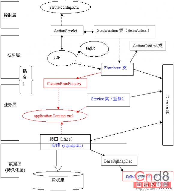 CustomBeanFactory类在本文中只用于表现层的form bean对象获得service类的对象,因为我们没有把form bean对象配置在applicationContext.xml中。但是,为什么不把表现层的form bean类也配置起来呢,这样就用不着这CustomBeanFactory个类了,Spring会帮助我们创建需要的一切?问题的答案就在于form bean类是struts的ActionForm类!假如大家熟悉struts,就会知道ActionForm类是struts自动创建的:在一次请求中,struts判定,假如ActionForm实例不存在,就创建一个ActionForm对象,把客户提交的表单数据保存到ActionForm对象中。因此formbean类的对象就不能由spring来创建,但是service类以及数据层的DAO类可以,所以只有他们在spring中配置。