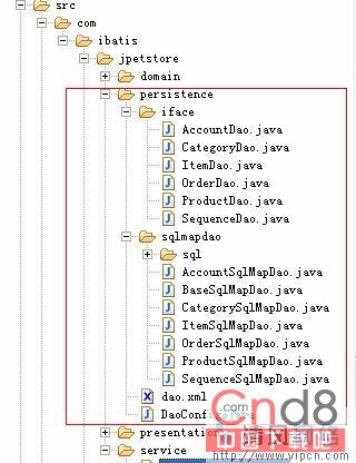 - com.ibatis.jpetstore.persistence.iface包下的类是DAO接口,属于业务层,其屏蔽了底层的数据库操作,供具体的Service类来调用。DaoConfig类是工具类(DAO工厂类),Service类通过DaoConfig类来获得相应的DAO接口,而不用关心底层的具体数据库操作,实现了如图2中{耦合2}的解耦。