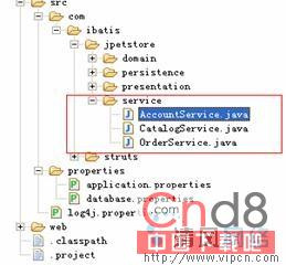 - Service类位于com.ibatis.jpetstore.service包下,属于业务层。这些类封装了业务以及相应的事务控制。Service类由form bean类来调用。
